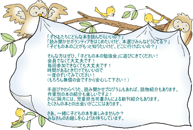 それでも子どもたちに本を通して楽しい思いや、わくわくする体験をたくさんして欲しいという会の思いは昔も今も変わりません。そのためのボランティア向けの研修や勉強会、講座などで、そのお役に立ちたいと願っています。